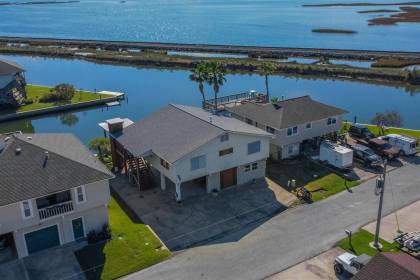 Location! Location! Location! This Great 3-2.5 Canal Front Home faces East with Amazing Views of Tiki Island, Galveston Island and Harbor Walk. 70 ft. Of waterfront. Concrete bulkhead. Second Lot from main canal. Boat Ramp and Boat House. THIS HOME HAS INCREDIBLE VIEWS THAT RARELY COME ON THE MARKET. Over $70,000 of Improvements. Enclosed Cargo Lift. Room for a pool. RV parking. Many parking places. Enjoy the cool breezes in the breezeway. Fisherman's and Bird Watcher's Paradise. Open Living/Dining/Kitchen rooms. Large Living Room with wall of windows. Nice size bar. Covered deck with outstanding views. Primary bedroom has walk-in closet, separate bathroom and Incredible Views. Second bedroom has a walk-in closet. Seller is updating the home-new interior and exterior paint, new luxury vinyl floors, new ceiling fans and many other updates. Damaged pilings have been replaced. Large storage room. Washer and dryer is included. All measurements are approximate.
